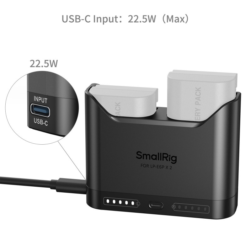 Entwickelt für professionelle und leidenschaftliche Amateurfotografen, bietet das SmallRig Ladegerät für LP-E6P eine effiziente, schnelle und sichere Lösung zum Aufladen Ihrer Canon-Batterien. Dank des Doppelslots-Designs ermöglicht dieses Ladegerät das gleichzeitige Aufladen von zwei Batterien und optimiert so Ihre Vorbereitungszeit im Feld.